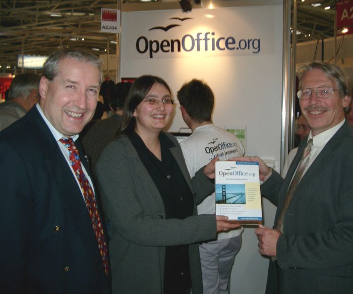 Herr Wilhelm Hoegner, Leiter des Amtes für Informations- und Datenverarbeitung (AfID) der Stadt München, konnte sich am Messestand auf der Systems aus erster Hand über den Entwickungsstand von OpenOffice.org informieren. Die Projektmitglieder gaben Auskunft über die aktuelle Version 1.1.3 und die geplanten zukünftigen Entwicklungen des freien Office-Pakets. Die Vorstandsmitglieder Jacqueline Rahemipour und Thomas Krumbein des frisch gegründeten Vereins "OpenOffice.org Deutschland e.V." übergaben Herrn Hoegner symbolisch eine OpenOffice.org PrOOo-Box und wünschen im Namen des gesamten Teams der Stadt München zur geplanten Migration zu Linux viel Erfolg.